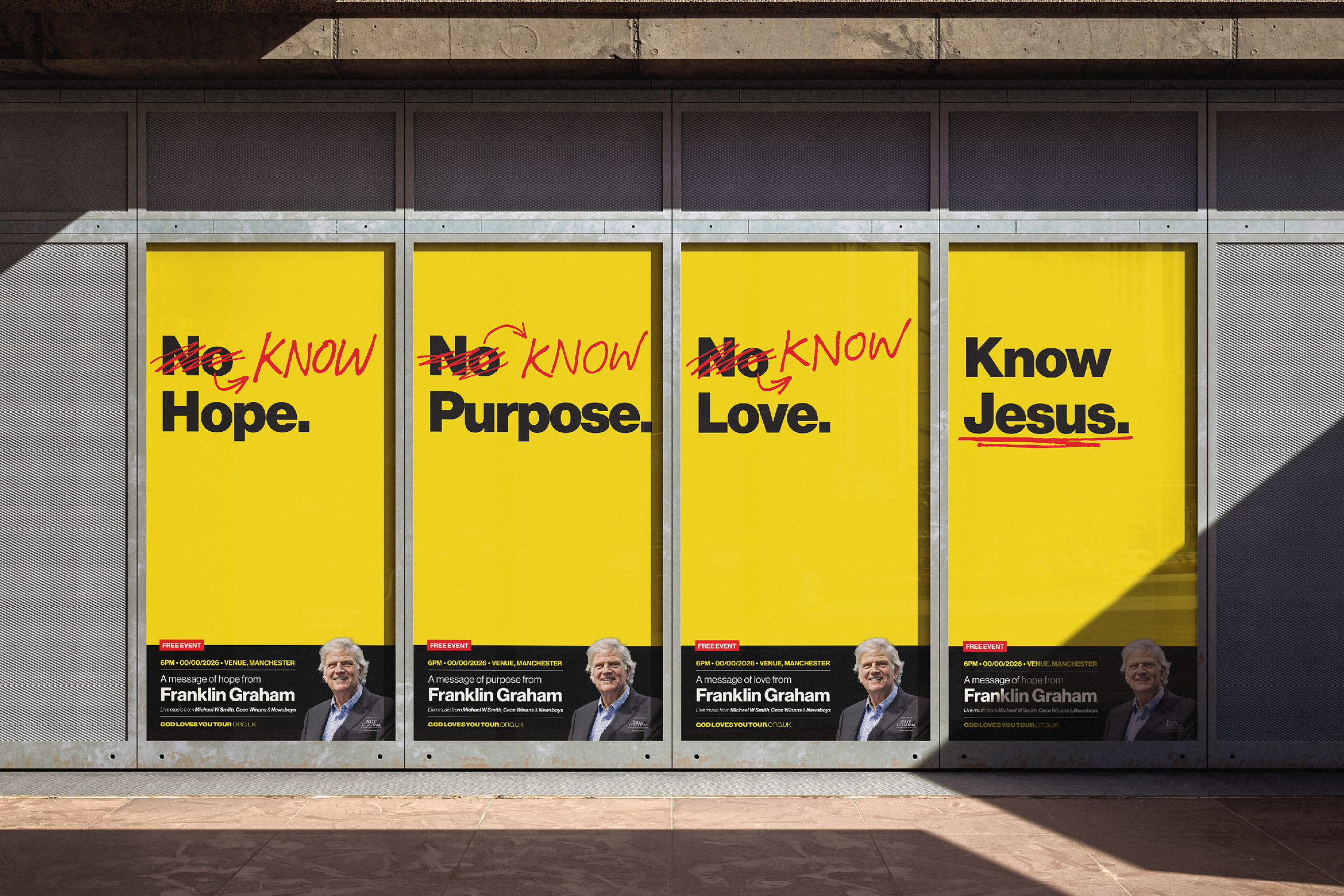 This was the unique challenge posed to us by the Billy Graham Evangelistic Association. Since 2023, we’ve developed a series of OOH advertising campaigns to fill arenas in London, Birmingham, Glasgow and Manchester so that thousands can hear about who Jesus is—while adhering to government regulations on what can be communicated through outdoor advertising channels like bus sides, billboards and digital signs.